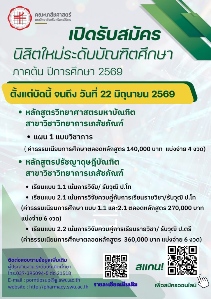 คณะเภสัชศาสตร์ มศว เปิดรับสมัครนิสิตใหม่ระดับบัณฑิตศึกษา ป.โท/ป.เอก ภาคต้น ปีการศึกษา 2569
