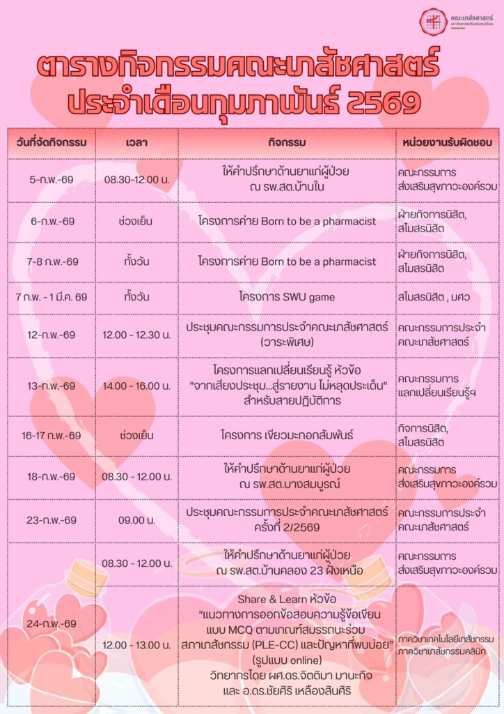ตารางกิจกรรมคณะเภสัชศาสตร์ประจำเดือนกุมภาพันธ์ 2569 29/01/202629/01/2026 webmaster กิจกรรมน่าสนใจ Post Views: 264 FacebookFacebookXXLINELine webmaster