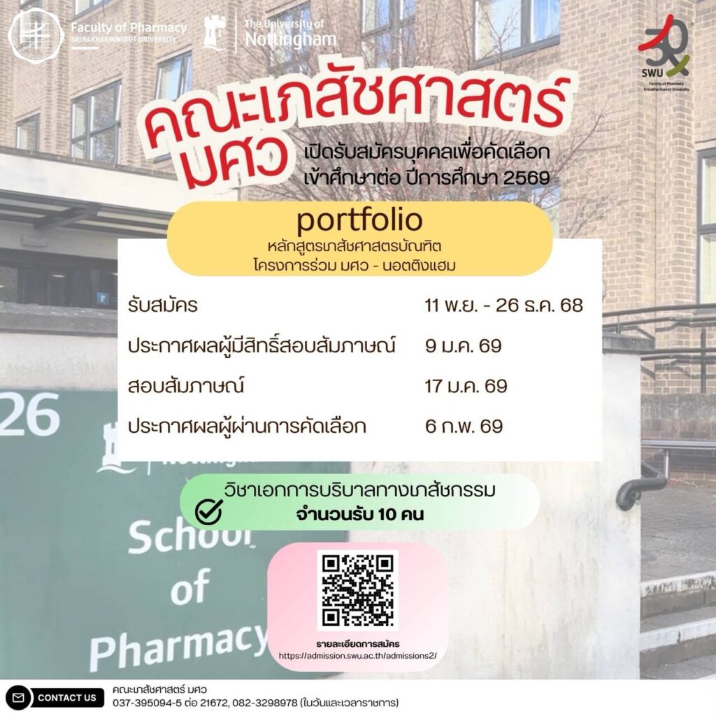 เปิดรับสมัครบุคคลเพื่อคัดเลือก เข้าศึกษาหลักสูตรเภสัชศาสตรบัณฑิต (โครงการร่วมระหว่างคณะเภสัชศาสตร์ มศว กับคณะเภสัชศาสตร์ มหาวิทยาลัยนอตติงแฮม สหราชอาณาจักร) ปีการศึกษา 2569 13/11/2025 webmaster ข่าวประชาสัมพันธ์ทั่วไป คณะเภสัชศาสตร์ มศว Tcas รอบ 1 (Portfolio) ปีการศึกษา 2569 ……………………………………………………………… เปิดรับสมัคร : 11 พ.ย.-26 ธ.ค.68 ……………………………………………………………… ดูรายละเอียดระเบียบการรับสมัคร https://admission.swu.ac.th/admissions2/ Post Views: 196 FacebookFacebookXXLINELine webmaster